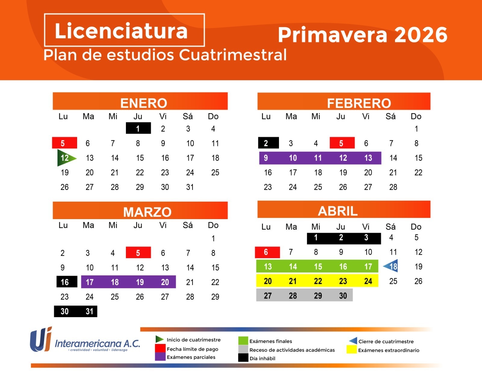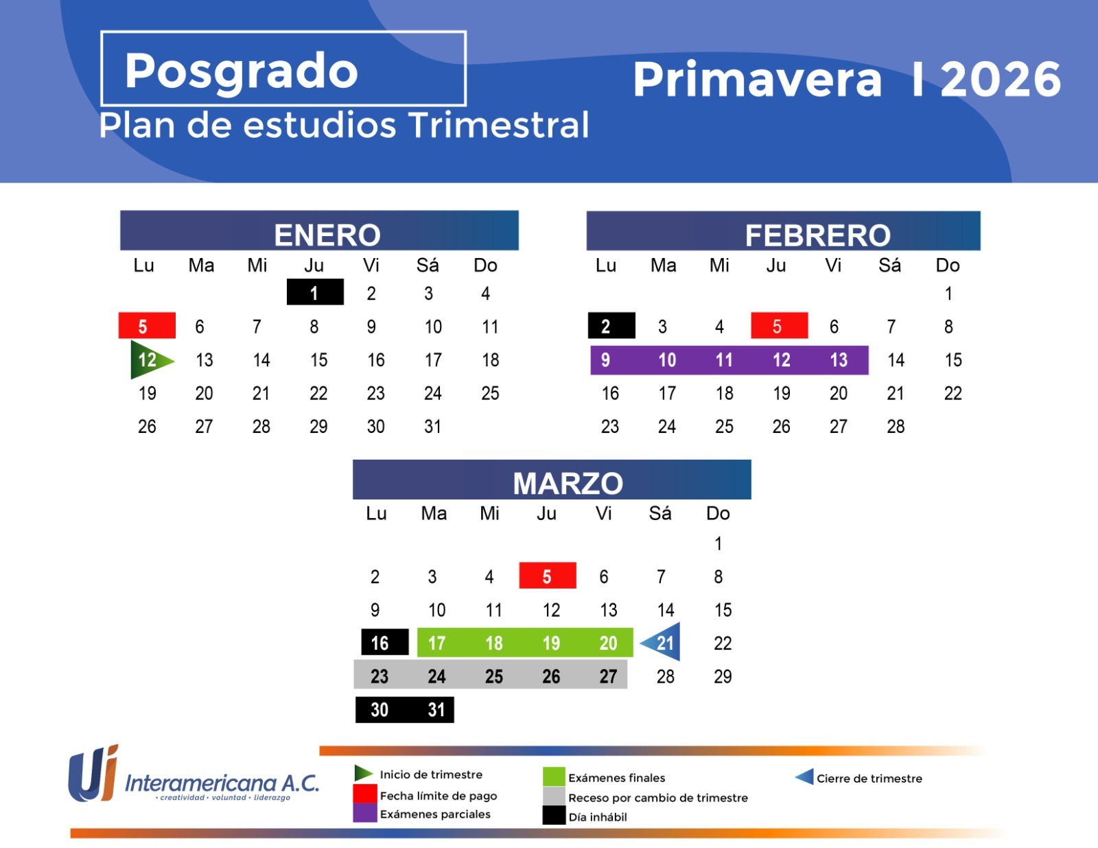 Inicio de clases: 12 de eneroExamenes Finales: 17 – 20 de marzoCierre de semestre: 21 de marzo