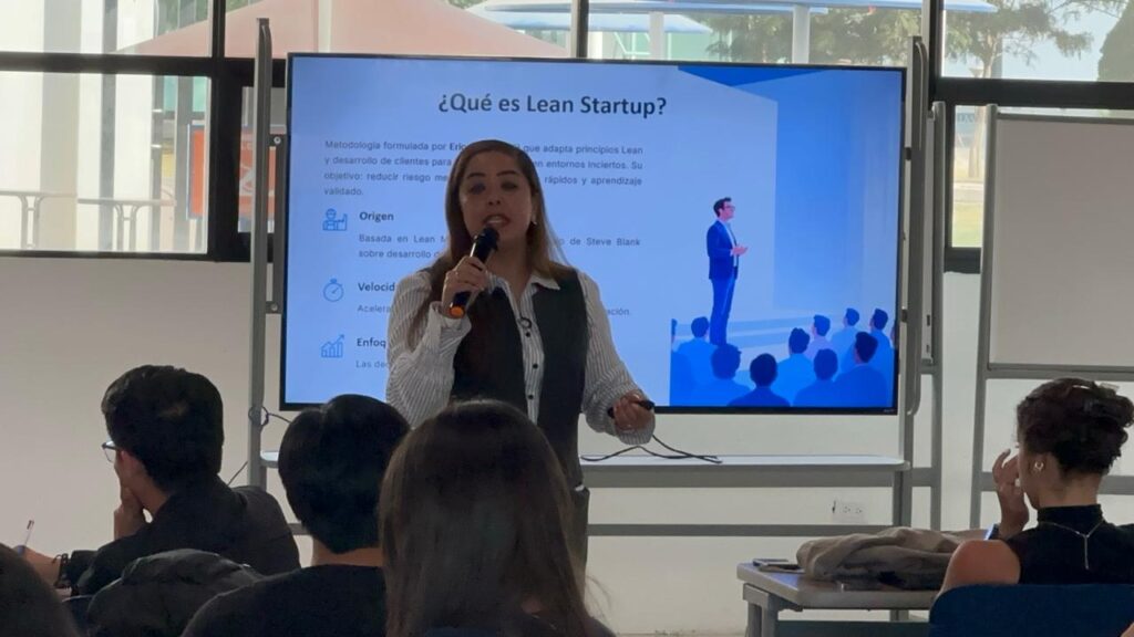 Durante su intervención, la Maestra Mayra Landero explicó que el Lean Startup es un enfoque que adapta principios de gestión y desarrollo de clientes para lanzar productos en entornos inciertos, cuyo objetivo principal es reducir riesgos a través de experimentos rápidos y aprendizaje validado.